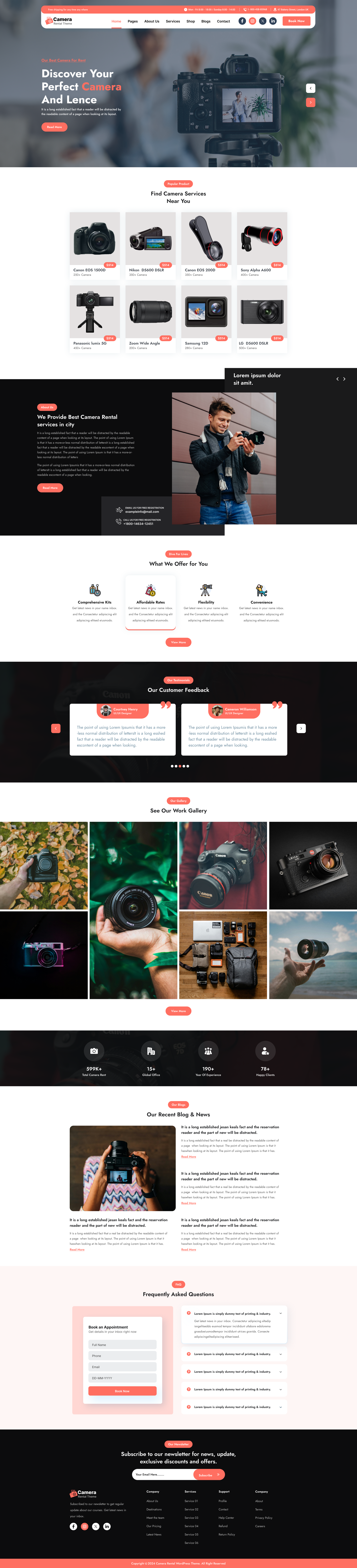 The Camera Rental WordPress Theme is designed for businesses offering camera and video equipment rentals. Whether you're focused on DSLR rentals, lenses, or advanced filming gear, this theme provides the ideal platform to showcase your services. Tailored for various rental needs like event photography, cinematography, and architectural photography this theme allows you to create a professional online presence with ease. Featuring a clean, modern design and a responsive layout, it ensures your website looks great on any device. The customizable features include sections for your rental policies, service offerings, and pricing, enabling you to set clear terms for customers. The theme is optimized for faster load times and comes with built-in SEO options, ensuring you reach a broader audience. With integration options for social media, testimonials, and a powerful call-to-action button, you can drive engagement and boost conversions. Whether you rent equipment for independent filmmakers, photographers, or content creators, the Camera Rental WordPress Theme offers a professional and sophisticated online solution for your business.